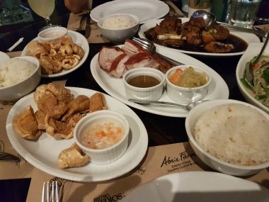 - Chicken Adobado (PHP 390; top right of picture below) - A dark dish consisting of pieces of chicken with bones in a soy sauce-based sauce.