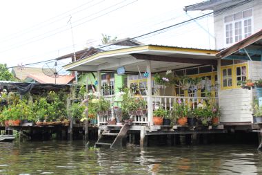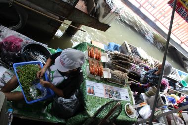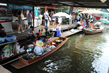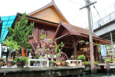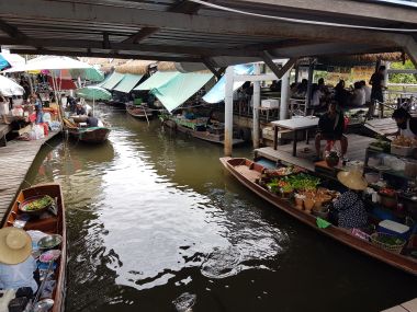 The 25 minute (85 baht; £1.95) trip took us over the largest river in Bangkok, the Chao Phraya River, on the older “Somdet Phra Pin-klao Bridge” along a busy highway then through a residential area to drop us off on a non-descript street corner and pointed in a general direction. The busy street barely had any pavement so we had to step out into the roadway to get around, following the signs to the floating market which was, thankfully, only a short distance away.