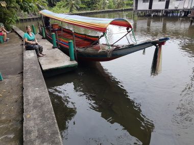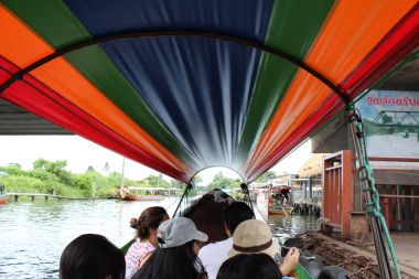 It was only a few minutes to wait for our boat to arrive on a dock under a concrete road bridge - It was a long thin boat seating about 20 passengers, two abreast on wooden benches under a rainbow-coloured plastic roof and powered by a what looked to be a car engine with a 10 foot long propeller shaft sticking into the water off the back of the boat steered using a long pole attached to the engine by a gentleman sitting on a box high enough to see over our heads.