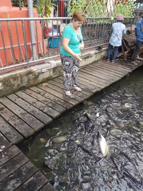 Back at the market we were helped off the boat and left to our own devices though we had had some time to think about what we wanted to do. First we headed back to a section of water separating the floating foot boats from the market on the land where we watched as people fed a large shoal of catfish. They are quite fascinating to watch. Mel bought some bread for 12 baht (£0.28) to feed to the fish that was obviously there for this purpose.