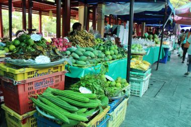 Along the road leading into the market were a large number of stalls selling exotic looking garden plants and others selling fresh fruit and vegetables - Green mango, green oranges, dragon fruit, kumquats, bitter melon, herbs of all kinds, lotus seeds (helpfully labelled or we would not have had a clue), apples, multi-coloured cherry tomatoes, hot peppers, and many others we could not identify.