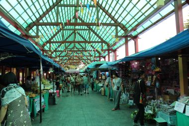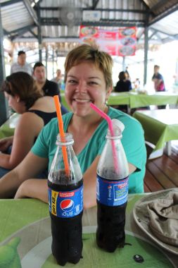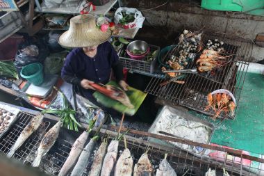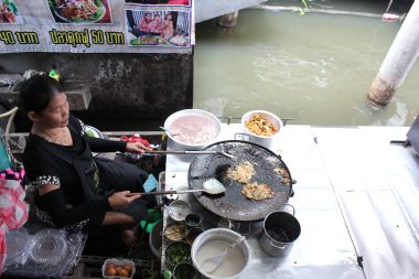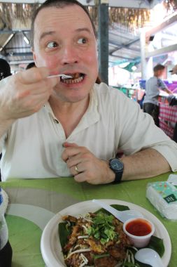 How it worked was you sat down at one of the tables then you were given a set of menus by a “waitress” who took your order then gave it to one of the boats moored up alongside. We were not really that hungry but sat down to try a few things. We ordered 16 satay chicken skewers (60 baht; £1.38) - served on a banana leaf with two wonderful dipping sauces; a mussel omelet (40 baht; £0.92) we had been watching a little old lady cook with amazing dexterity in a large round skillet - served with fresh bean sprouts, coriander and spring onions with a spicy dip, delicious and not in any way fishy; and, of course, several cold soft drinks in an attempt to beat away the heat. It was unlike any food court I had ever been in before (the lizards climbing around the interior of the roof being another unique selling point) and the people were just so nice!