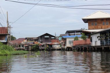 As we pushed off and quickly got up to speed (and it was fast, yes) what struck me was how lush the shoreline was. Picture postcard wooden houses on stilts with copious amounts of trees and plants in between. Access to the buildings, none more than two stories high, was obviously by boat with steps leading to the water at each spot along the narrow canal lined with utility poles. Everywhere you looked was interesting with each ramshackle building different from its neighbour with the occasional satellite dish poking from a roof to remind you that this is the 21st century. We passed all the trappings of a living community: Various temples, shops, and schools all along the water. Occasionally side canals would meet with our larger strip of water that we could see were also lined with buildings. It was not all pretty with the occasional concrete apartment block but for the most part it was small wooden structures poking out of the water.