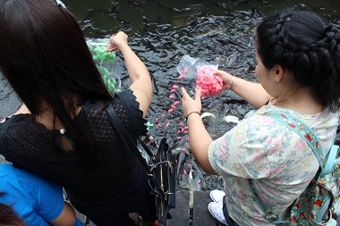 They were also selling some brightly coloured puffed snacks that several women were feeding to the fish as well, the orange and pink pieces dancing on the dark grey surface as the black fish clambered over themselves to get at them. Quite mesmerising.
