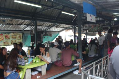 It was close to lunchtime so we walked back out onto the pier then onto a long covered seating area in which low tables were set out. In the water alongside were a series of narrow boats tethered up cooking various dishes.