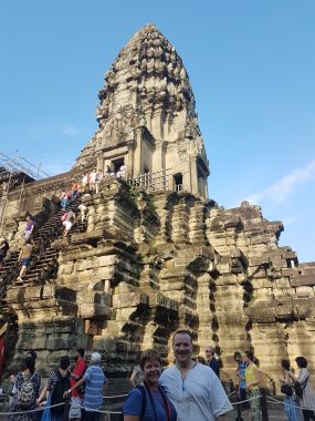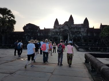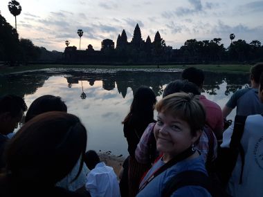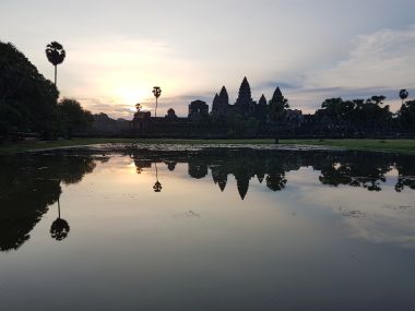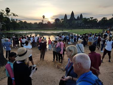 Mel and I managed to get quite close to the shoreline where we could see the ruins reflected in the calm surface of the pond as the sun slowly rose. The hundreds of tourists all had various photographic equipment. Some had tripods set up in the mud, some just using their phones and others with very fancy cameras indeed. Despite this it was quieter than you might think with only a gentle murmur.