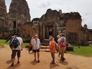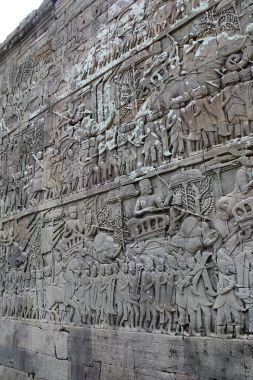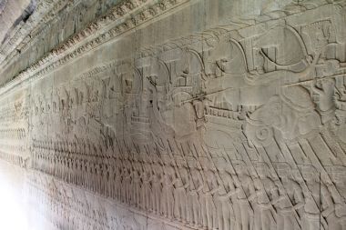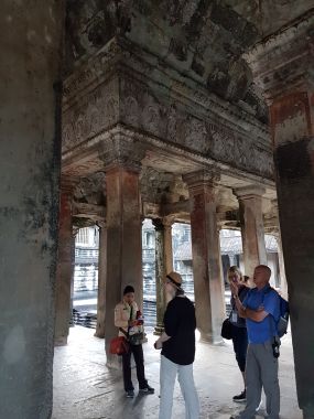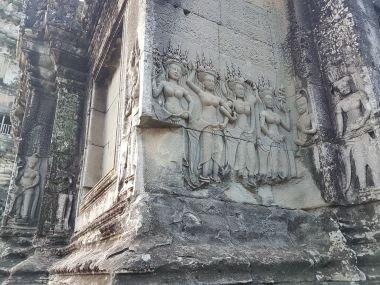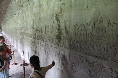 We were next taken to the gallery surrounding the temple where we were shown some amazing bas relief carvings that told a story as you followed them around. An impressive 1,000 square meters of intricate and extraordinary carving that are generally in quite good shape though Rous pointed out the results of several misguided attempts in the past at restoration including concrete and other destruction of the original materials. Thankfully now they are much more sensitive to the preservation of the site that is continually suffering from water and, of course, visitor damage. Amazing depictions of vast armies, gods and fantastic creatures.