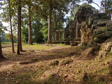 Here there were no tourists as we walked along the path through the jungle then through the ruins of the containing wall before once again crossing the moat this time on a dirt causeway. Surrounding us were the most amazing trees and it was quite peaceful with no one else around.