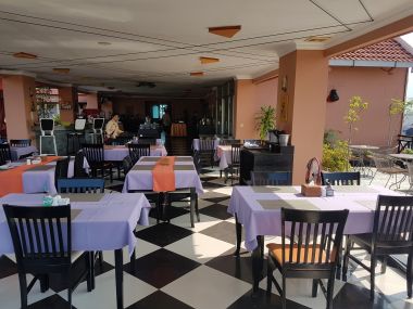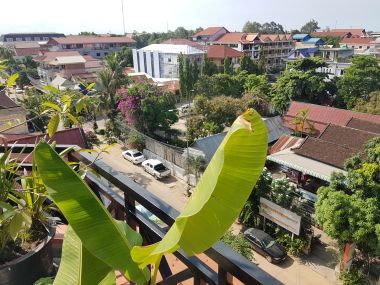 Still only 8:30 in the morning we returned to the hotel for breakfast. After a quick stop in the room to drop our bag we headed up onto the roof, the sixth floor, where the buffet was set out. Mel and I sat at a table right on the edge of the roof looking out over the town spreading in all directions. It is not the most pretty of places. The buffet was OK but nothing like the hotel in Bangkok. Some fried rice, bread and fruit were enough for us though (the so-called “orange juice” is beyond the pale - I just can’t stand artificial!).