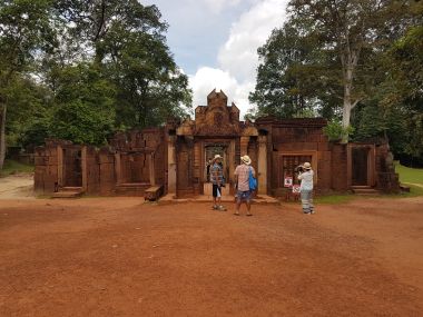 An hour later we arrived at our next temple, Banteay Srei, which was far less busy than Angkor Wat was earlier. The ticket booth and entrance is quite modern with a large tourist market full of stalls beside it. There was a bit of hassle from kids trying to get us to buy things as we entered but generally is was very quiet. I picked up a cold drink while we waited for the rest of the group and Rous to give us an introduction to the site before we walked to it. This is a 10th century temple often called the “citadel of the women”, or “citadel of beauty” because of its intricate bas relief carvings. An information panel talked about the importance of irrigation and how extensive it was when these structures were built.