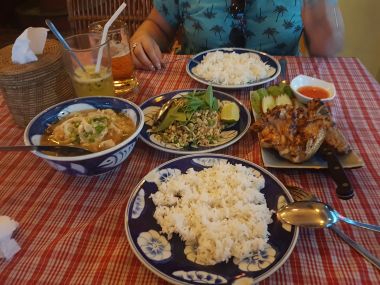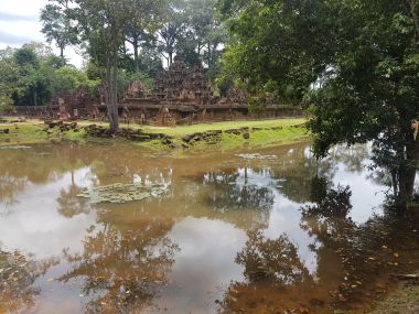 It had been quite some time since breakfast so we stopped for lunch at a small touristy place beside an irrigation lake (Srah Srang) the Khmer Angkor Kitchen nestled in amongst the trees. Upstairs was air conditioned so we sat down and relaxed. It had been a lot of walking in the heat so we were all needing a bit of relaxation. Mel and I shared a portion of “Khmer Curry” (pork; $7.75) that included rice which was very nice and quite a generous portion size too. Yeah, just a coke on the side as they did not have any really interesting things to drink ($1.75).