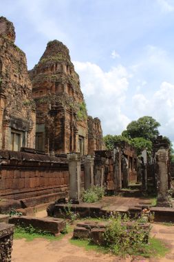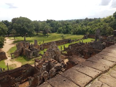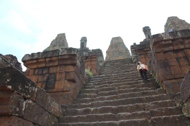 About thirty minutes later we arrived at the next site which was just off of the road: “Prae Roup” (Pre Rup) temple. This is a much smaller, simpler and older temple (10th century) though with several rude large towers (“prasat”) in the middle. I immediately headed up a tall set of stairs in the middle for the view of the surrounding area which was a bit tough in the heat (it was 1:30 already). Again we saw some laterite in the walls but the temple towers were built of much smaller bricks. It was nice to just sit and take it all in. Very few tourists here though there was a small group of stalls at the edge of the car park opposite.