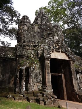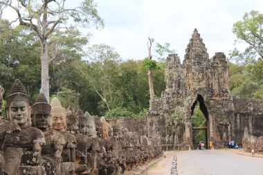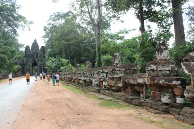 We were headed to the truly massive 3km by 3km “Angkor Thom” the 13th century Khmer capital city with the “Bayon Temple” in the exact centre. Before entering the ruins of the city we stopped just before passing under the “Victory Gate”. A bridge over the moat has two a long, carved, seven headed naga serpent carried by rows of figures on either side about 100 m or so long. Rous told us that the French have attempted unsuccessfully to repair some of these statues using concrete but it is still an incredible sight. Most the figures have lost their heads but you can really see what they must have been like when they were first carved.