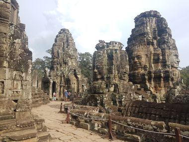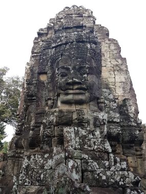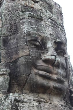 Back in the bus we were taken around to the eastern entrance of the temple where as we were leaving the bus a few people expressed an interest in visiting the toilets so three of us that were not so keen got out to have a look at the temple while the bus left in search of a toilet. The entrance is over a path of large carved stones with the temple consisting of many cone-shaped towers with large faces carved into them. The faces are amazingly lifelike and all very different from one another. All around the exterior of the temple are yet more elaborately carved murals showing various battles. I was able to climb all around the ruins though particularly delicate areas like the murals were, of course, hands-off. A short time later the toilet group returned and Rous gave us a bit of a tour of the temple, explaining about some of the carvings. Mel and I climbed to a higher level in the temple to have a look around. There were not many tourists here so it was quite good to take in the ambiance and wonder of it all for a few minutes. Everywhere the carved smiling faces look down on you. It looks at times like the whole place is just about to crash back down into the jungle - poised on the edge of complete destruction.