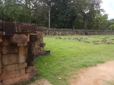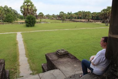 Our group continued along the rest of the stone path into the temple as Rous told us more about the complex. The wide stone path has massive carved stone railing with expanses of green grass surrounding it then the large trees of the jungle. Walking up to the temple the scale is very impressive yet does not feel overly oppressive. The wall around the central temple is 187 m by 215 m and houses a gallery with some wonderful bas reliefs that we had a closer look at later.