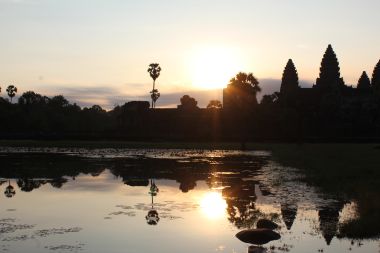 A low wall 1025 m by 802 m surrounds the island complex that we passed through the west gate into the temple itself. Rous guided us to the edge of a small pond to the left of the main stone path where there were already a lot of people waiting. She told us we should meet her back near the path at 6:15 and we scattered to try to find the best spot to see the sun. We could make out the famous pine-cone-shaped spires of the temple against the increasingly bright sky as we headed off to the far left of the pond where there seemed to be fewer people. There were a lot of people selling things - kids with postcards that they shoved into your face as well as locals selling pictures and other souvenirs laid out on blankets.