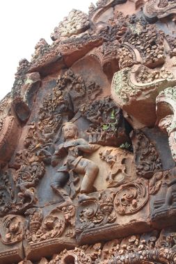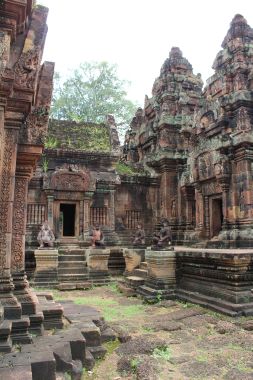 A long roadway through the trees led to the temple. It was quite a warm walk now as it was approaching the heat of the day. The temple is quite different looking with red sandstone featuring throughout. Tony is an archaeologist so gave us a bit of a lecture on the laterite used on the exterior of the temple - A red porous looking but very hard rock that has been carved into massive bricks. It is red because of the high iron oxide content. Evidently, for our Australian friends, this is quite a common stone there.