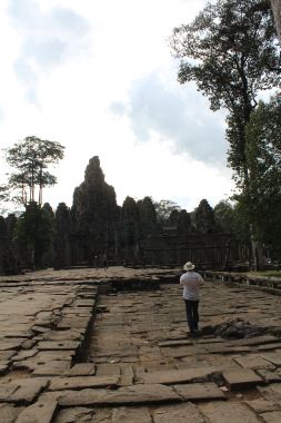 Driving into Angkor Thom the road stops to turn either left or right at a large balustrade - The “Elephant Terrace” so-called because of the numerous elements carved along its length. Turning left we immediately came upon the “Bayon Temple” - A fairly small temple (as it goes) in the middle of a square moat around which the road travels. We stopped briefly in a car park for people to get refreshments and look around. A few people were having their wedding photos taken with the magnificent backdrop. There was also a shine with a buddha figure clothed in gold. We were more interested in pictures of Bayon.