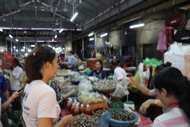 Back in the city busy with bikes, motorcycles, pedestrians, buses, cars, carts, and tuk-tuks we returned to the hotel at about 6 pm. Rous had given us some recommendations for dinner so Mel and I returned to our room for a few minutes then walked along the side of the canal to the market, passing by the Hard Rock Café before crossing the river. They are not so big on pavements (sidewalks) here so often we have to take our chances on the road. We passed by “Psar Chas” (the old market), taking a quick look in at the bustling food area which I found far more interesting than the cheap clothing and souvenirs for sale. It is definitely not fancy with plastic bowls full of all manner of seafood and fish.