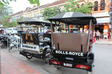 Back on the street we had a look at a few of the choices for dinner we had been given by Rous settling eventually for “Khmer Kitchen” (http://www.khmerkitchens.com/) on a corner right opposite the market. We were given a table inside the restaurant right on the corner of the two streets so we spent some time watching the traffic. Of course, the ground floor was entirely open to the outside so the noise of the street just added to the ambiance. We found amusing some of the names of the tuk-tuks parked outside: “Rolls-Royce”, “Batman Tuk Tuk”, etc.